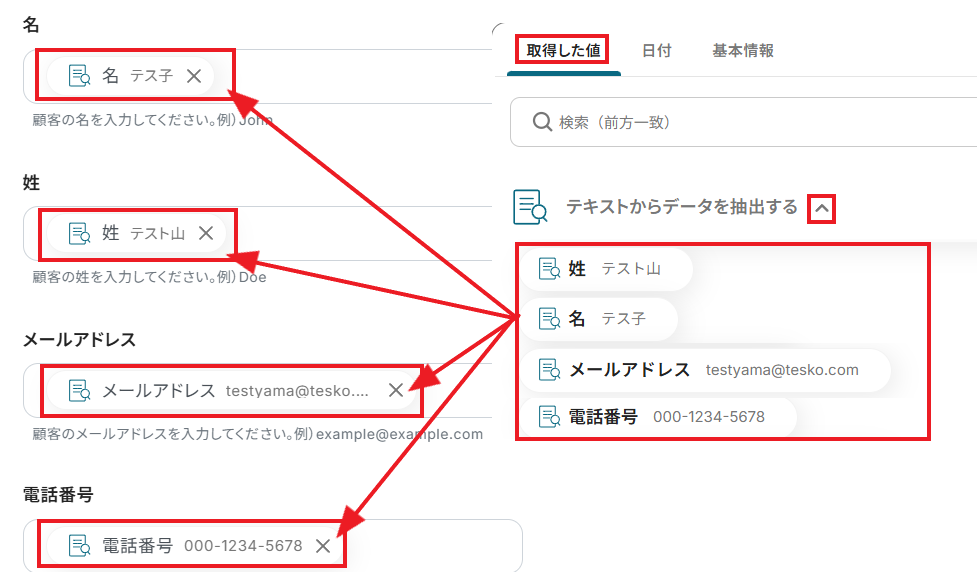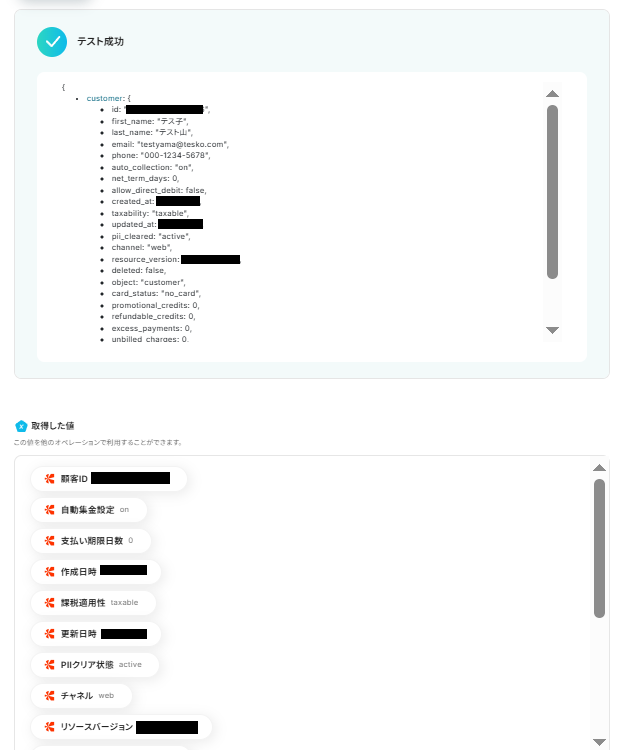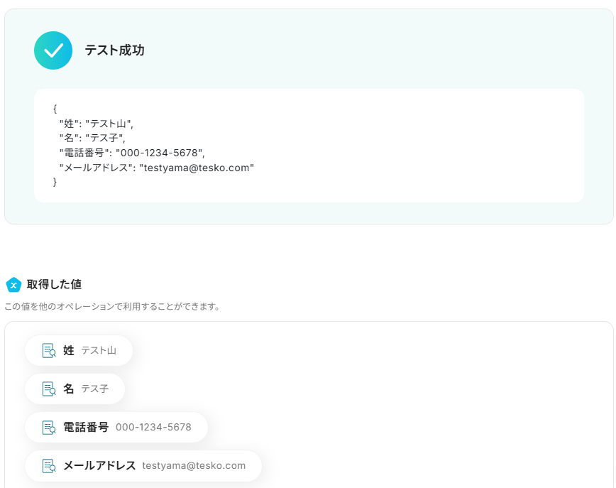AIが指示通りに情報を抽出していれば、「テスト成功」の文字とリクエスト結果、その下に取得した値として抽出された各項目が表示されています。