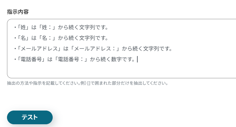 抽出したい項目を設定できたら、各項目をどのようなルールで抽出するのか、AIに分かりやすいような指示を入力します。