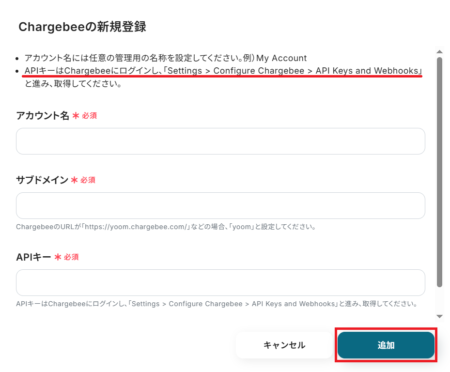 「サブドメイン」はChargebeeにログインした上でURLから抽出します。「APIキー」は以下画像の手順で発行し、ペーストして「追加」ボタンを押してください。