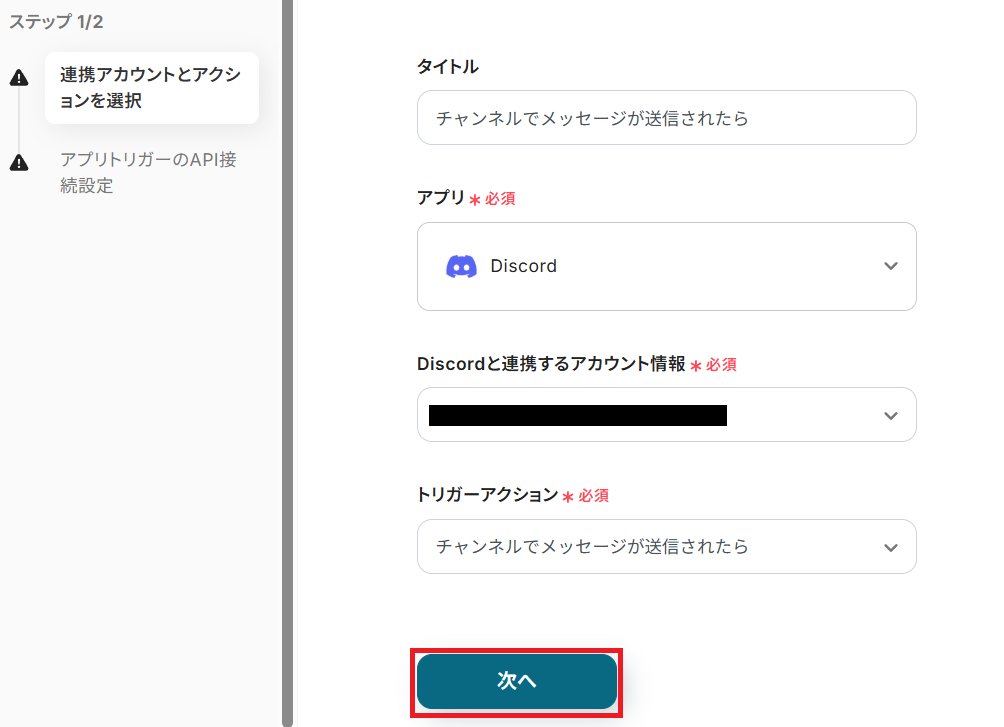 タイトルを任意で設定し、Discordと連携するアカウントやアクション内容を確認したら「次へ」を押してください。