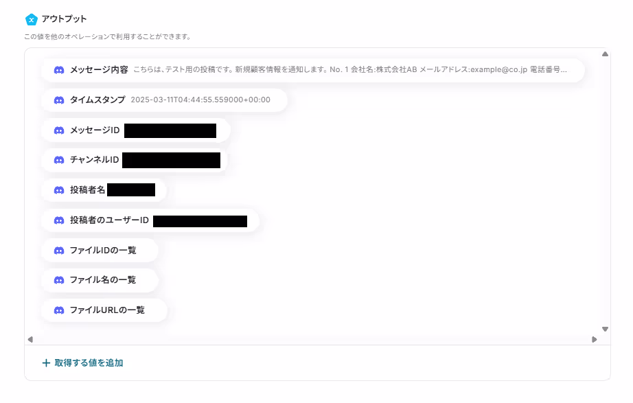 5.入力を終えたら、「テスト」を実行し、成功したら「保存する」をクリックします。 ※表示されているアウトプット は「この値を他のオペレーションで利用することができます。」と表記があるように、次の設定でも活用できます。