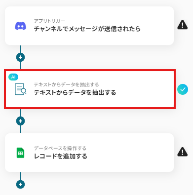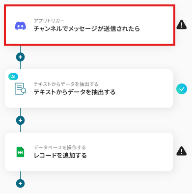 ※以下の画面は、Yoomページ画面左側「マイプロジェクト」のフローボットで表示される、「【コピー】Discordの投稿内容をもとにGoogle スプレッドシートにレコードを追加する」をクリックすると表示されます。