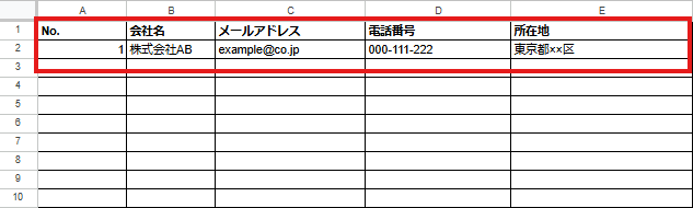 Google スプレッドシートのシートは、以下画像のように作成しました。設定が完了すると、このシートに投稿された顧客情報が転記されるイメージです。