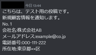 連携前に、Discordのチャンネルでメッセージを投稿しましょう! また、Google スプレッドシートにもシートを作成しておきましょう! ※今回は、顧客情報をDiscordからGoogle スプレッドシートに転記する想定で設定していきます。以下画像のようなメッセージを投稿しました。