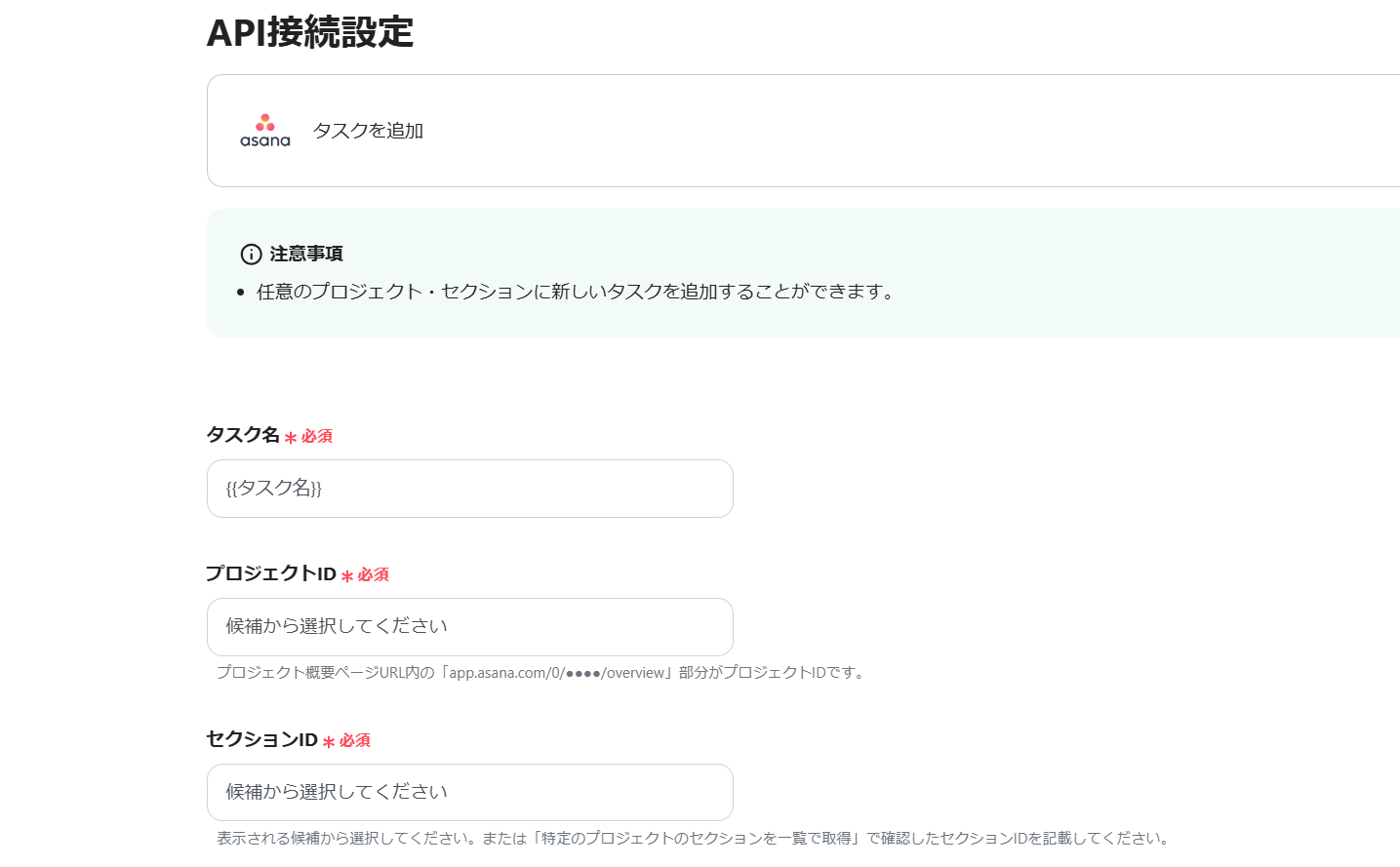 プロジェクトID、セクションIDは入力欄をクリックすると表示される候補から選択してください。
