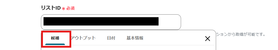 リストID、メンバーID、リストIDは入力欄をクリックすると以下の画像のように候補が表示されるので、その中から選択してください。