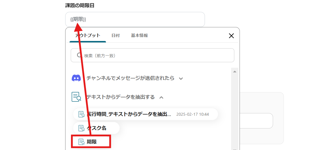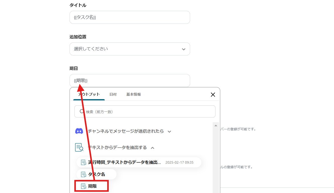 入力欄をクリックし、その後「アウトプット」→「テキストからデータを抽出する」を選択すると、AIがDiscordのメッセージから抽出した「タスク名」と「期限」が表示されます。必要に応じて活用してくださいね。