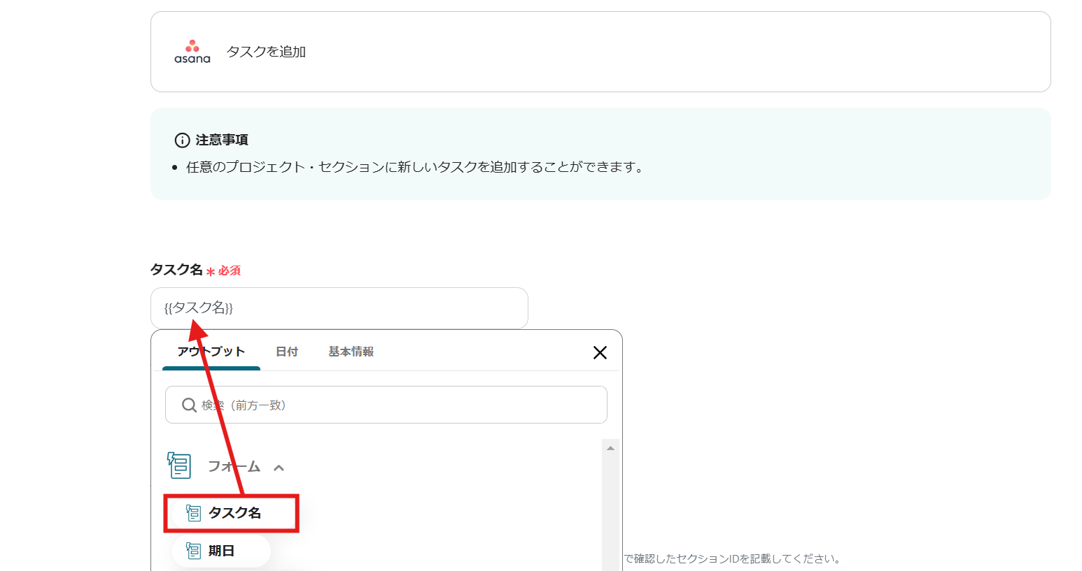 抽出したい項目は、今回のフローではタスク名と期限が設定されています。