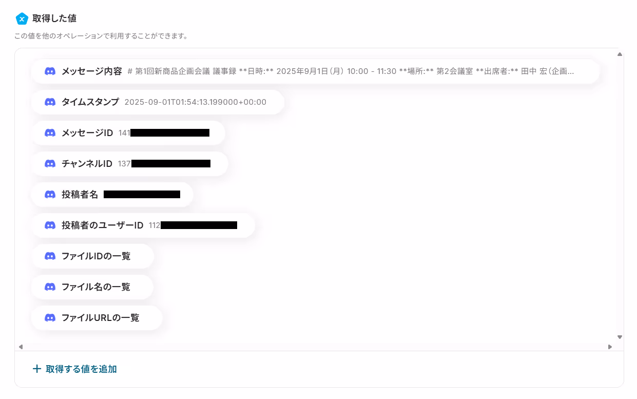 取得したメッセージ情報からポストに使用するデータを抽出していきます。
