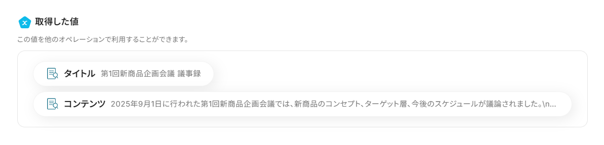 これらの値は、以降のアクションで変数(フローが稼働する度に更新される値)として使用できるようになります。つまり、これらのデータをMediumに自動登録可能です。