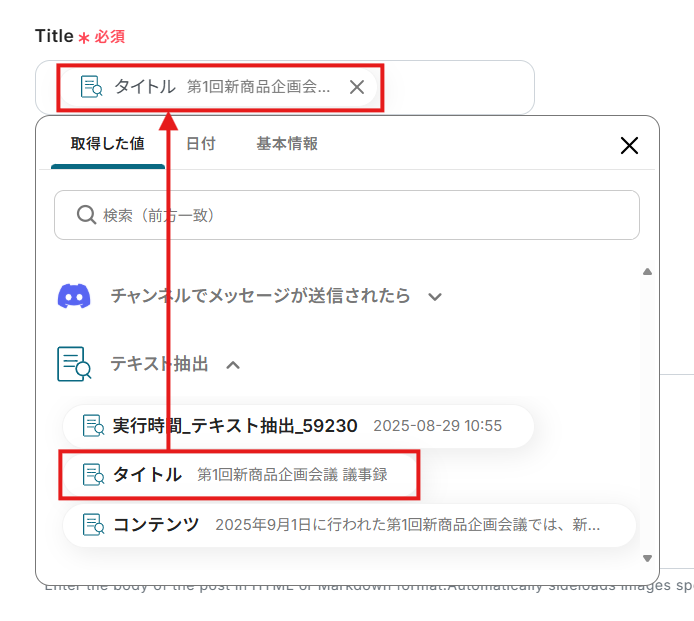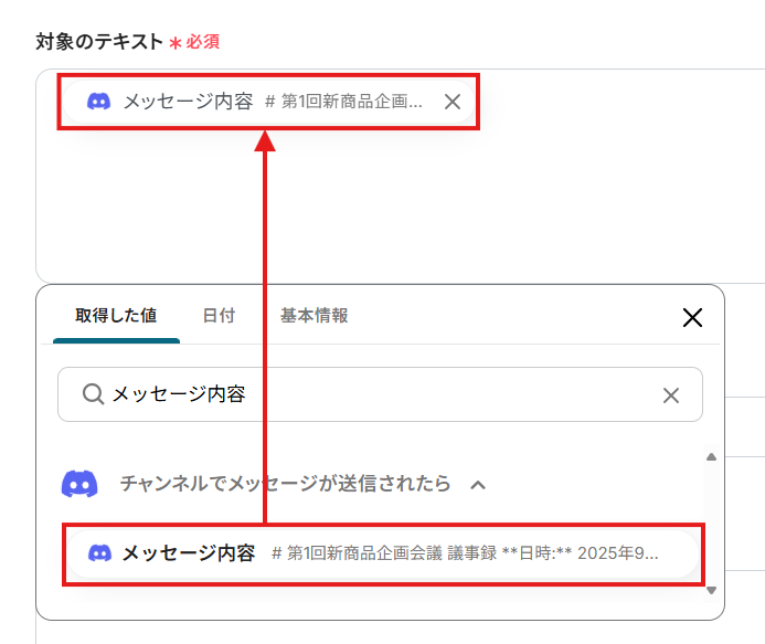 - テストに成功すると、「取得した値」に、Discordに送信した最新メッセージの情報が追加されます。