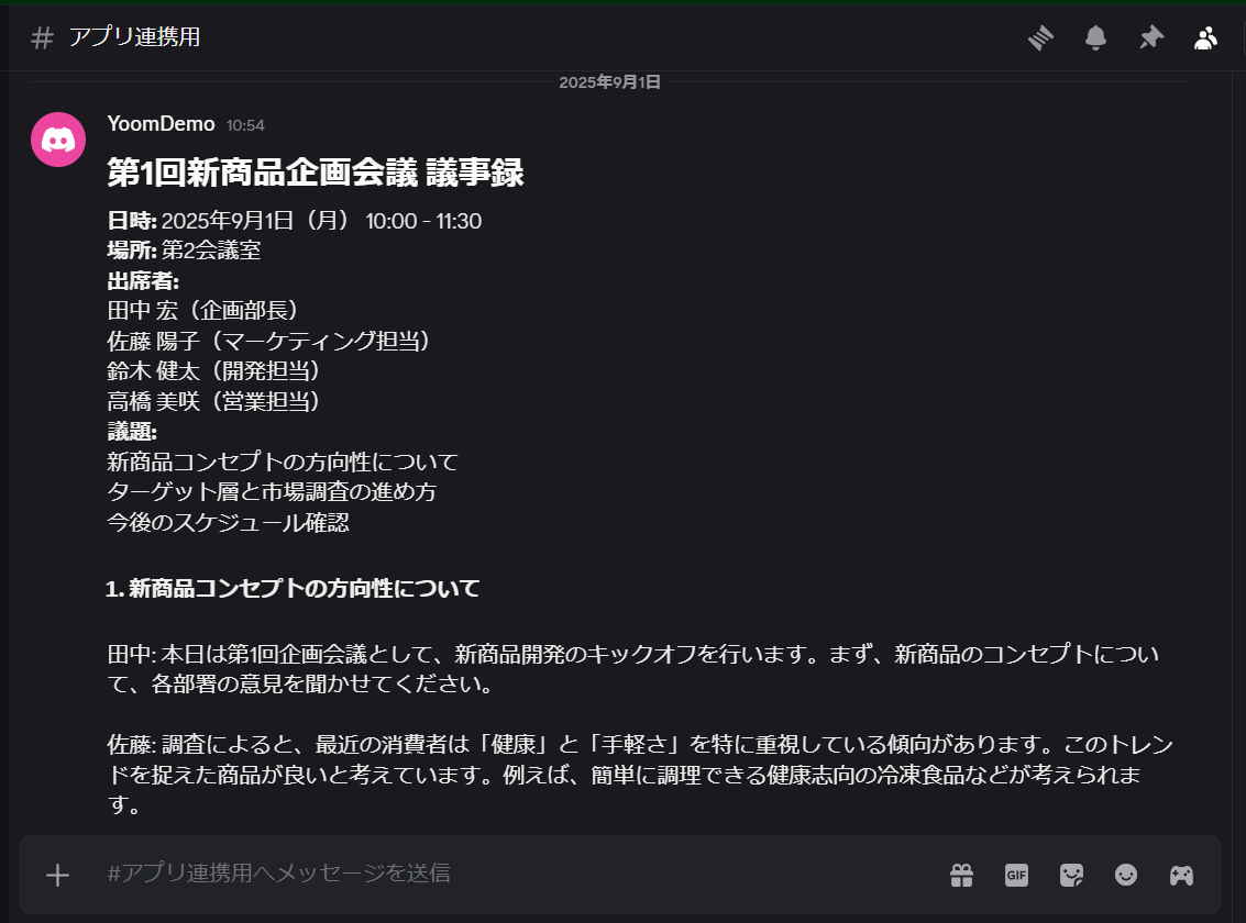 - 設定を終えたら、Discordの指定したチャンネルにYoomとの設定用テストメッセージを投稿してください。