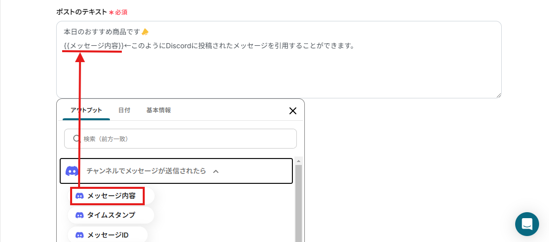 このように設定することで、Discordの特定チャンネルで新しいメッセージが投稿されたら「メッセージ内容」を自動で取得し、X(Twitter)のポストに自動で引用して投稿できます。