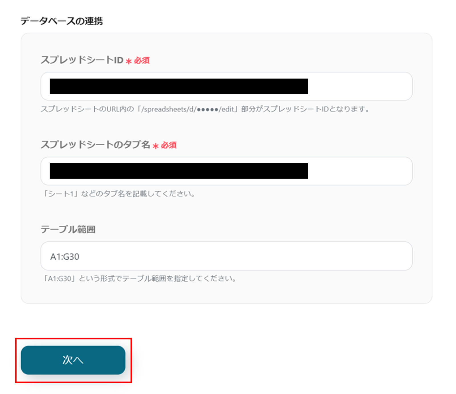 下へ進み、スプレッドシートID、スプレッドシートのタブ名、テーブル範囲を入力します。