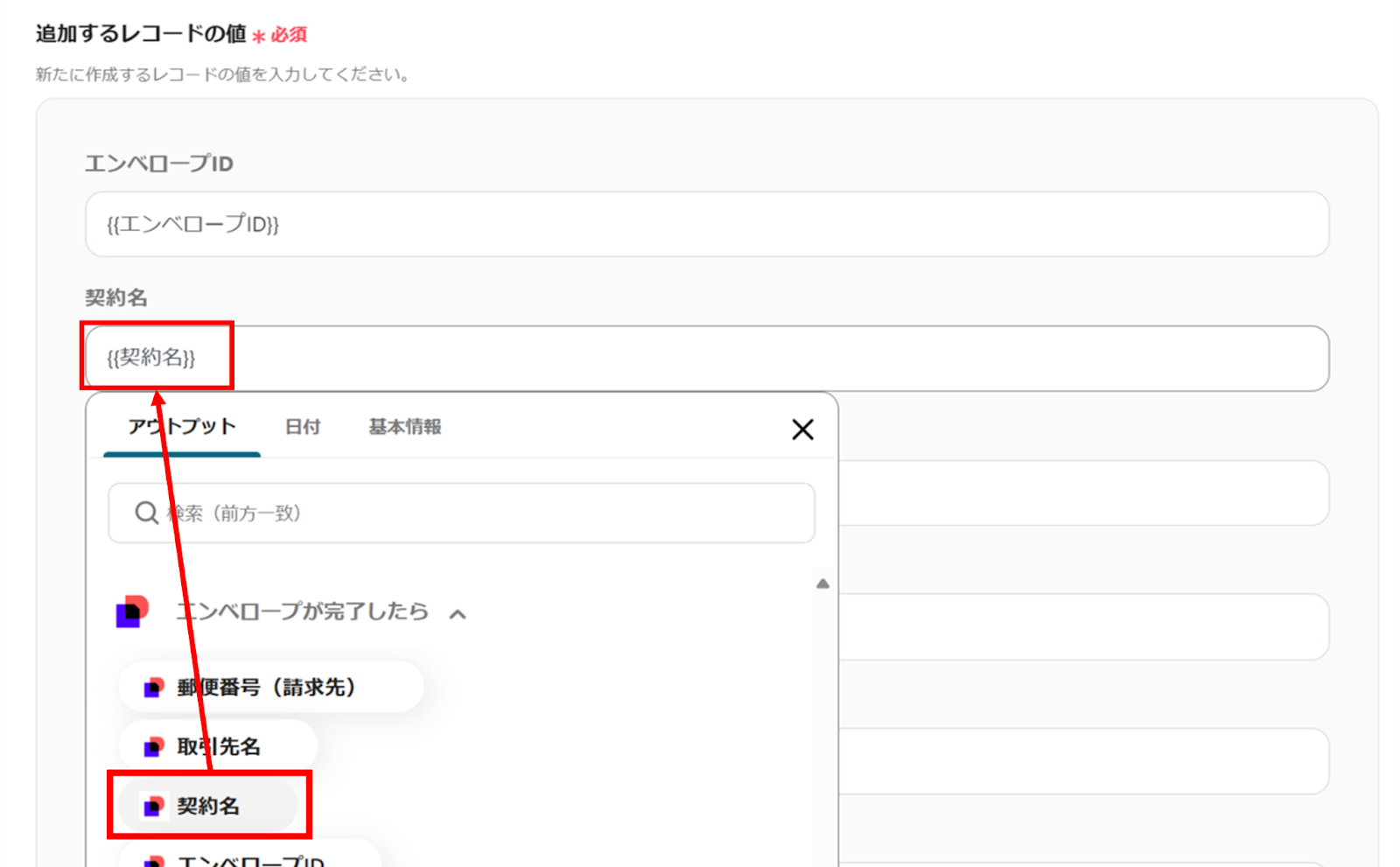 (3)「データベース操作の詳細設定」画面から、追加するレコードの値をアウトプットから選択します。
