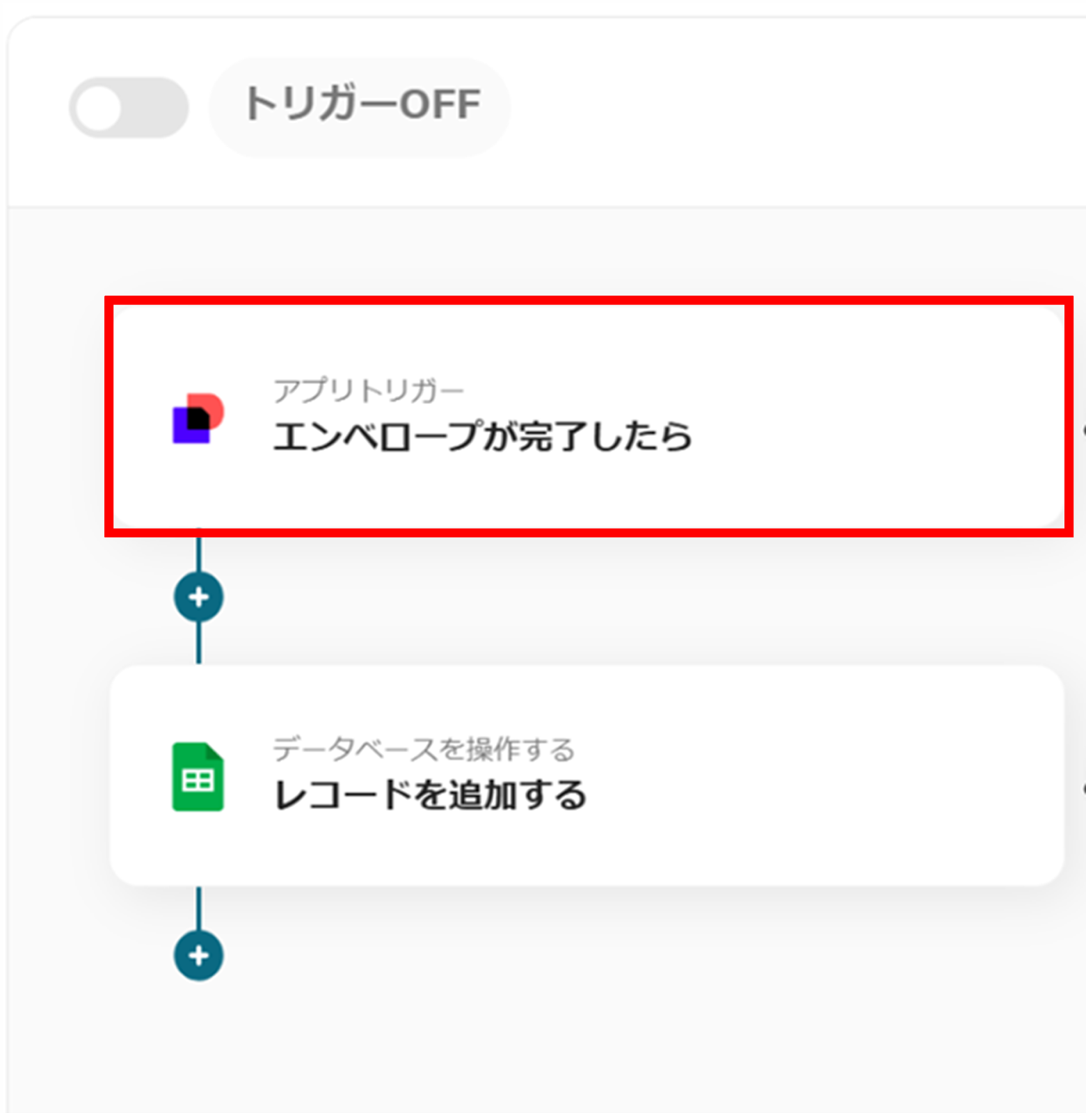 アプリトリガーの「DocuSignで契約が完了したらGoogle スプレッドシートに追加する」をクリックします。