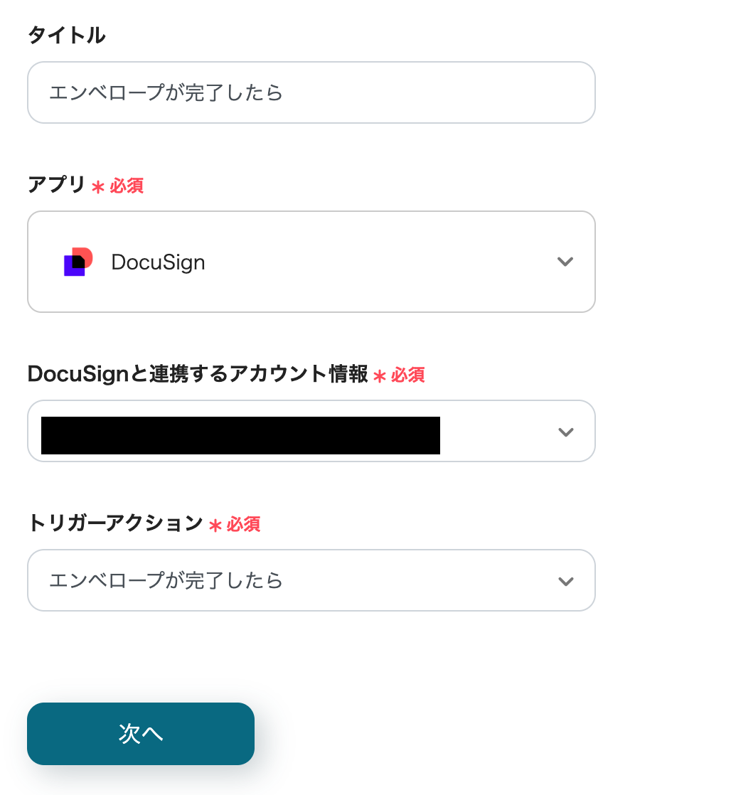 最初のページでは、事前に連携したDocuSignのアカウント情報が表示されるので確認し、問題なければ、「次へ」をクリックしてください。