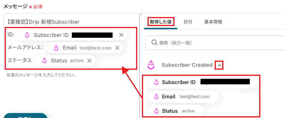なお、テキストを直接入力した部分は固定値とされるため、下記画像のように「【要確認】Drip新規Subscriber」などは手入力し、毎回変動することが望ましい「SubscriberID」などは取得した値を活用しましょう。