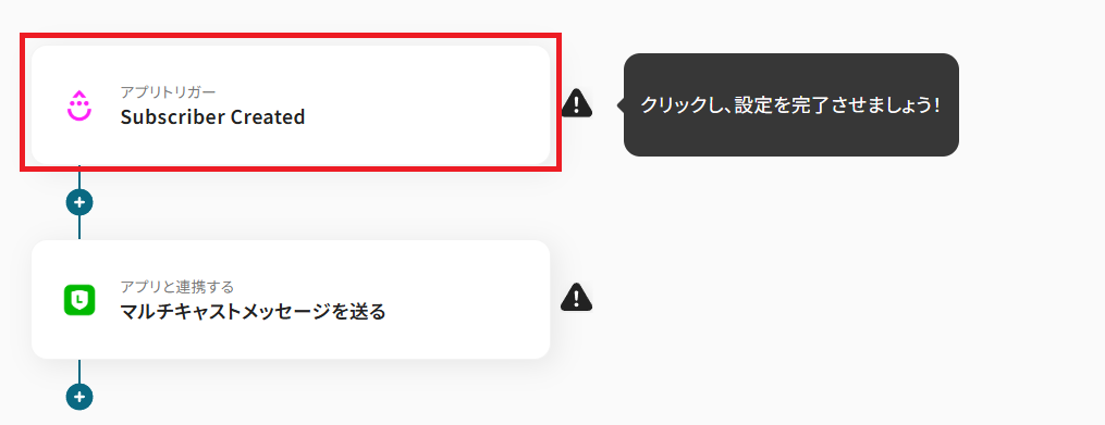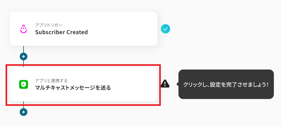 Dripで新たなSubscriberが作成されたことが検知されたら、LINE公式アカウントでその情報を共有するアクションを設定していきましょう。