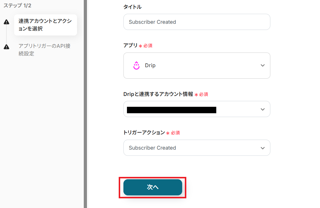 タイトルを任意で設定し、Dripと連携するアカウントやアクション内容を確認したら「次へ」を押してください。