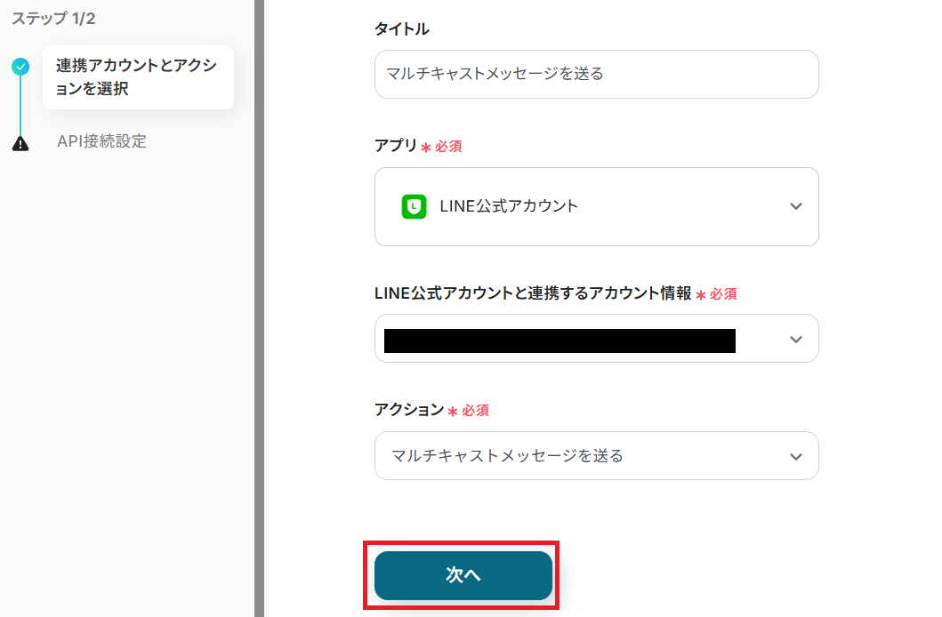 タイトルを任意で設定し、LINE公式アカウントと連携するアカウントやアクション内容を確認したら「次へ」を押してください。
