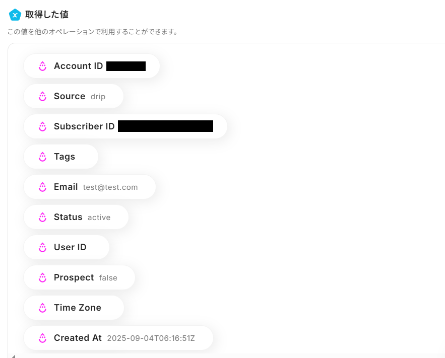 テスト用のSubscriberを追加できたら、Yoomの設定画面に戻って「テスト」ボタンを押してみてください。「取得した値」として、Dripに追加されたSubscriberの情報が反映されていれば成功です!「保存する」をクリックして設定を完了しましょう。