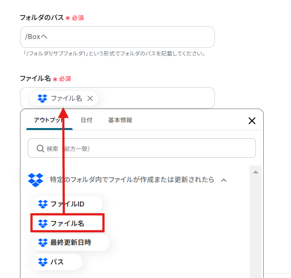 5.「ファイル名」で設定したキーワードが含まれるファイルを、実際にDropboxにアップロードしましょう!