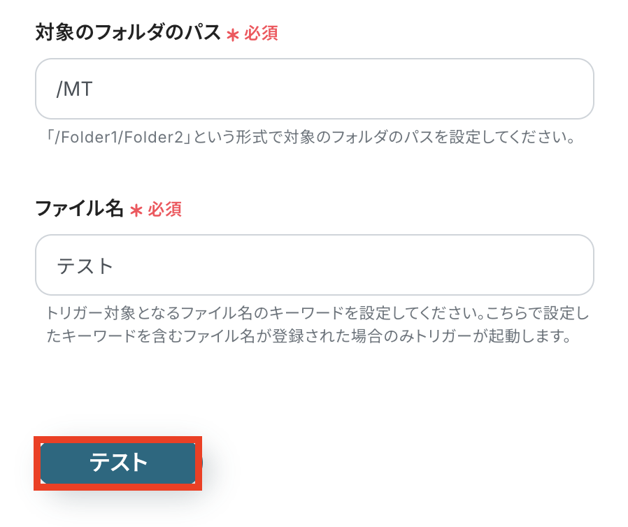 入力が完了したら、設定内容とトリガーの動作を確認するため「テスト」をクリックします。