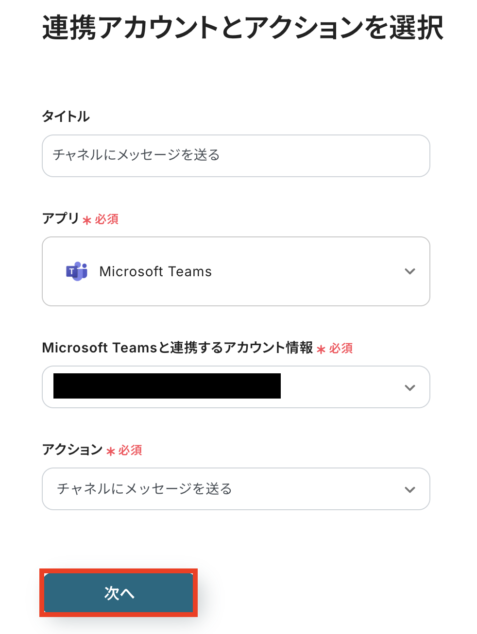 Microsoft Teamsと連携するアカウント情報に問題がなければ、「次へ」をクリックします。