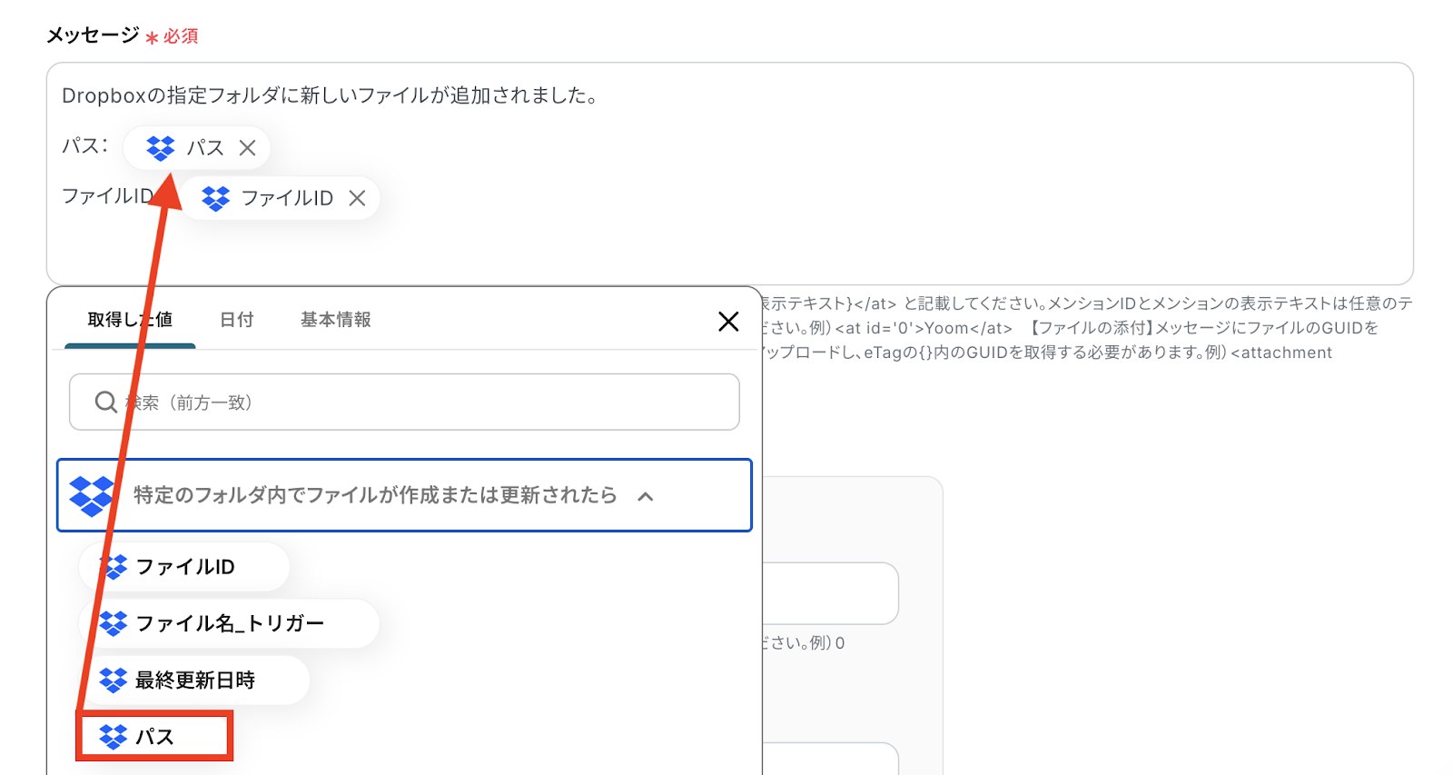 入力欄をクリックすることで、前のステップでDropboxから取得したアウトプットを挿入でき、任意のテキストと組み合わせて自由にメッセージを作成できます。