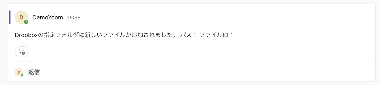 トリガーをONにすることで、Dropboxに新しいファイルが追加されたタイミングで、指定したMicrosoft Teamsのチャンネルに通知が自動で投稿されるようになります。
