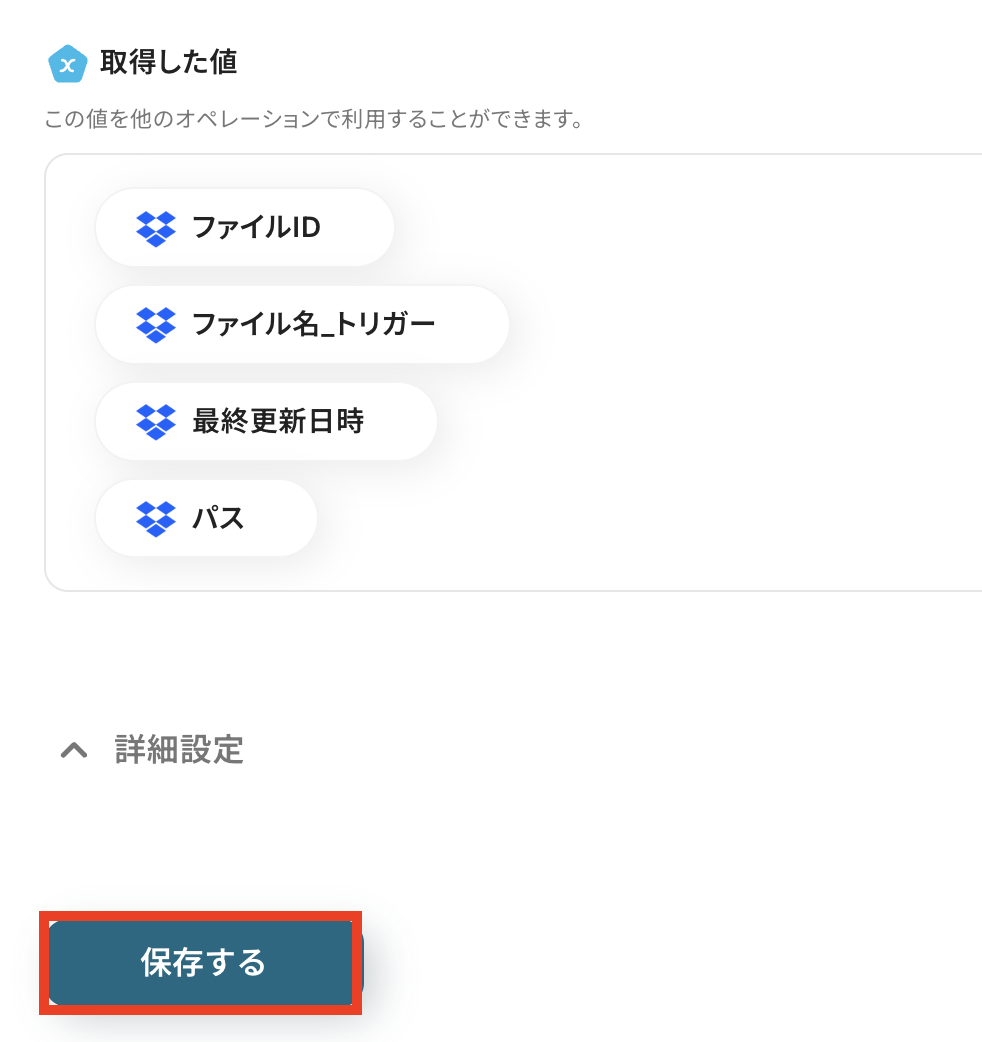 テストに成功すると、Dropboxに追加された新しいファイルに関する情報が一覧で表示されます。