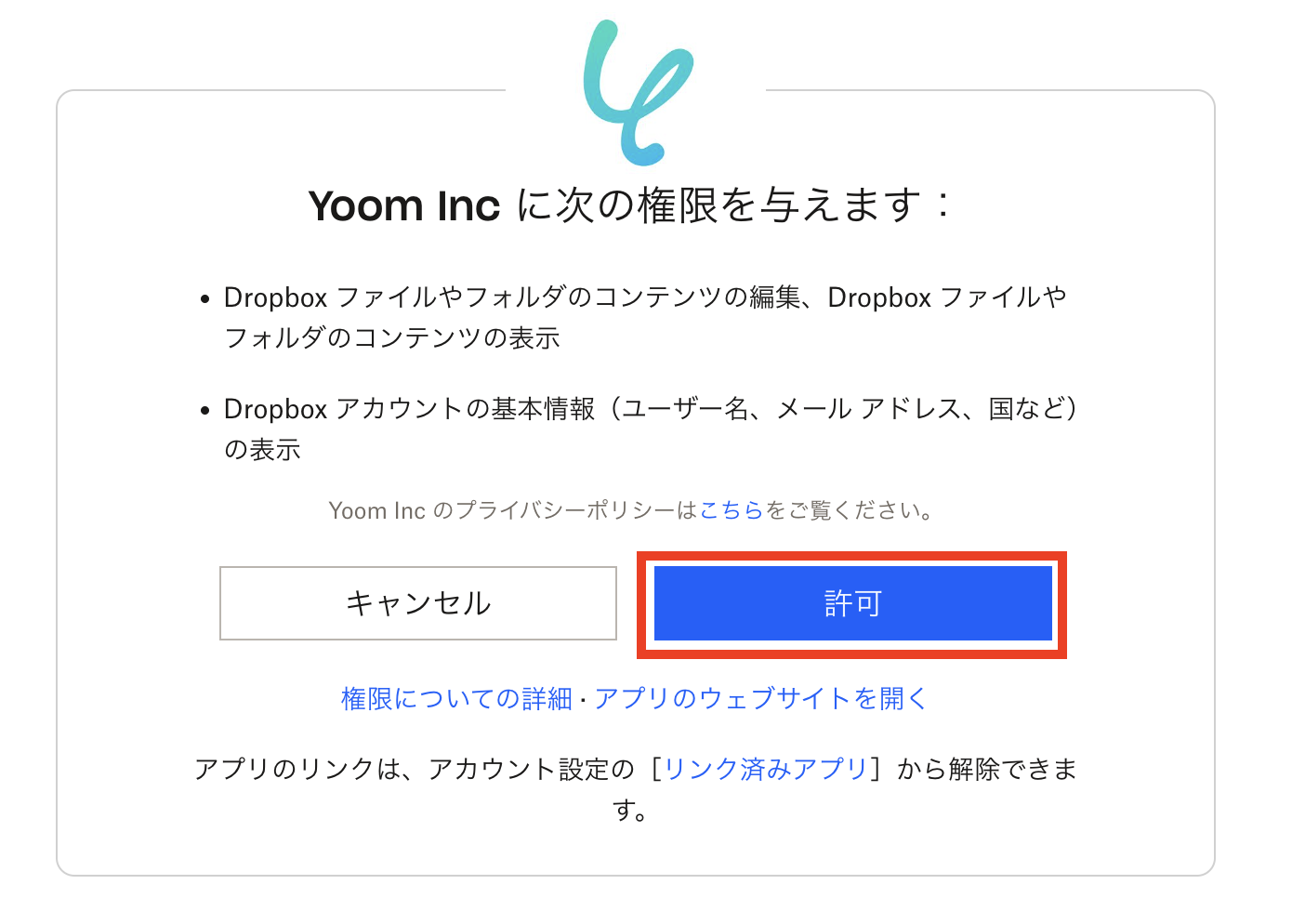 画面右上に連携したいアカウントが表示されていることを確認してから、「許可」をクリックしてください。