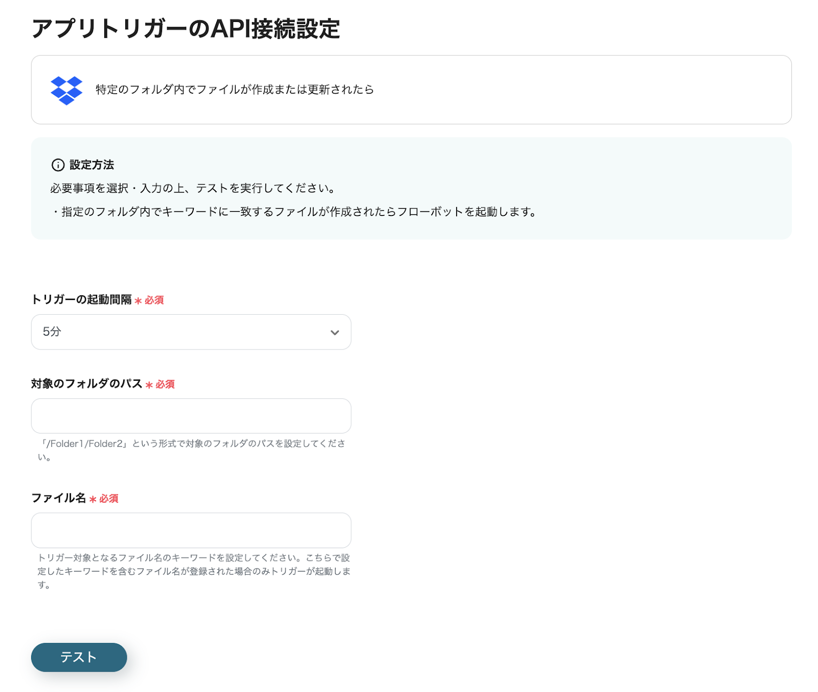 遷移する「アプリトリガーのAPI接続設定」ページで、トリガーの起動間隔、対象のフォルダのパス、ファイル名を設定します。