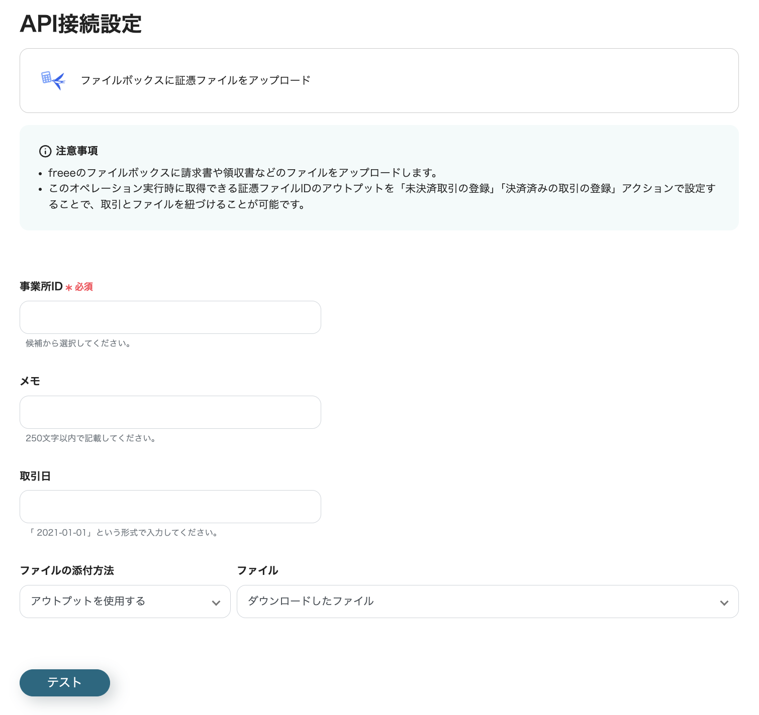 次に、freee会計のファイルボックスに証憑ファイルをアップロードするアクションを設定します。