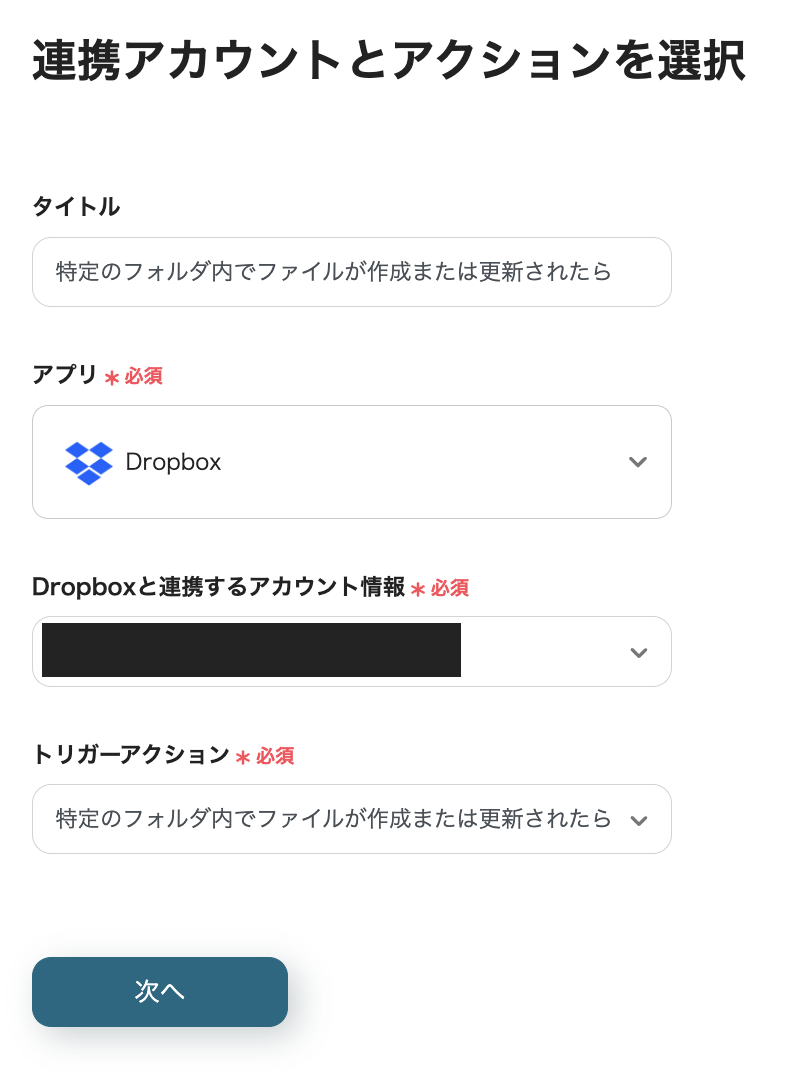 まず、フローの起点となるDropboxのトリガーを設定します。