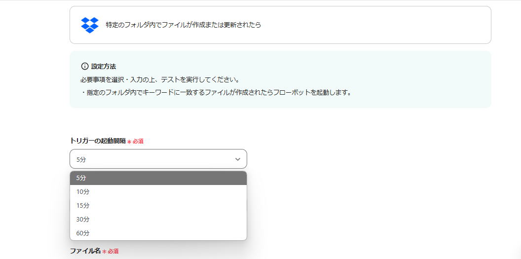 トリガーの起動間隔は、用途に合わせてプルダウンより設定してください。