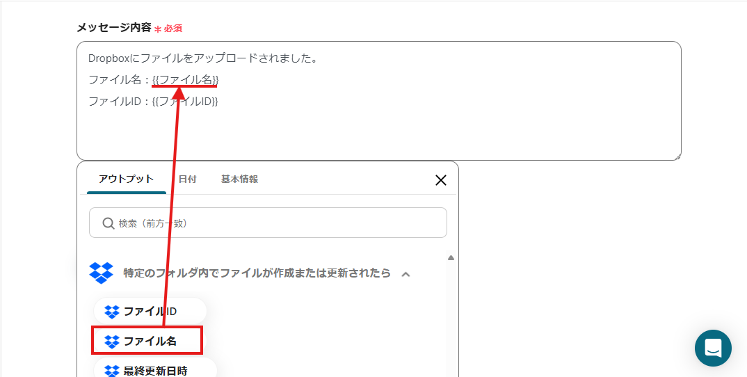 このように設定すると、Dropboxにファイルをアップロードしたら「ファイル名」と「ファイルID」をを取得し、Google Chatのメッセージに引用できます。