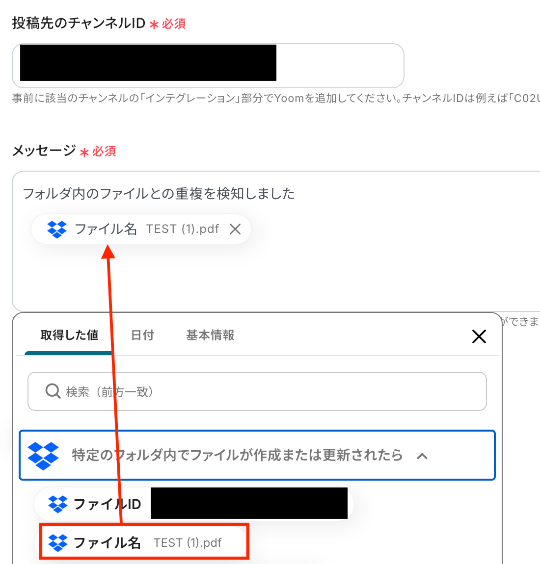 文中に、トリガーで取得した値の「ファイル名(TEST (1).pdf)」の値を差し込みます。
