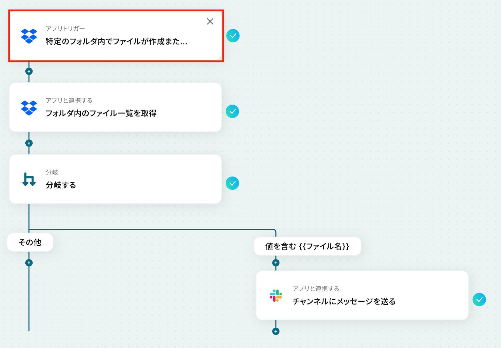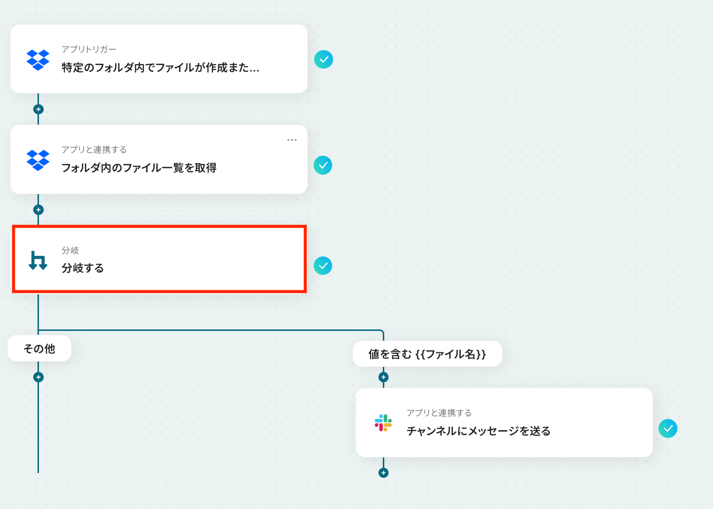 はい、可能です。Dropboxトリガーで取得したファイル名を「分岐する」の条件に使えば、「請求書」を含むときだけ経理へ通知、といった振り分けが行えます。
