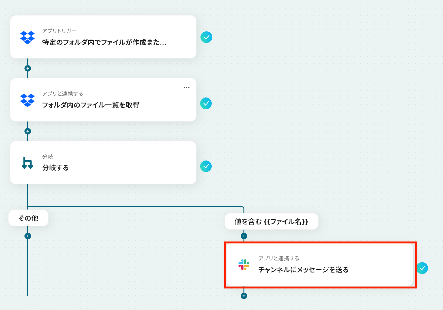 - 最後に、オペレーションでSlackの「チャンネルにメッセージを送る」アクションを設定し、分岐の結果に応じたメッセージを通知します