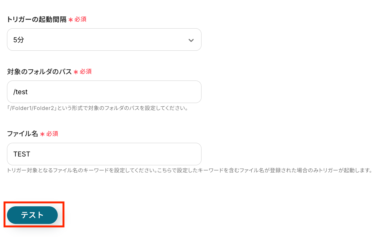 - Dropboxのトリガー設定では、レポートが格納されるフォルダのパスや、特定のファイル名を監視対象として任意に設定してください。