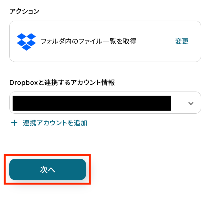 フロー画面で、Dropboxの「フォルダ内のファイル一覧を取得」アクションを選択します。
