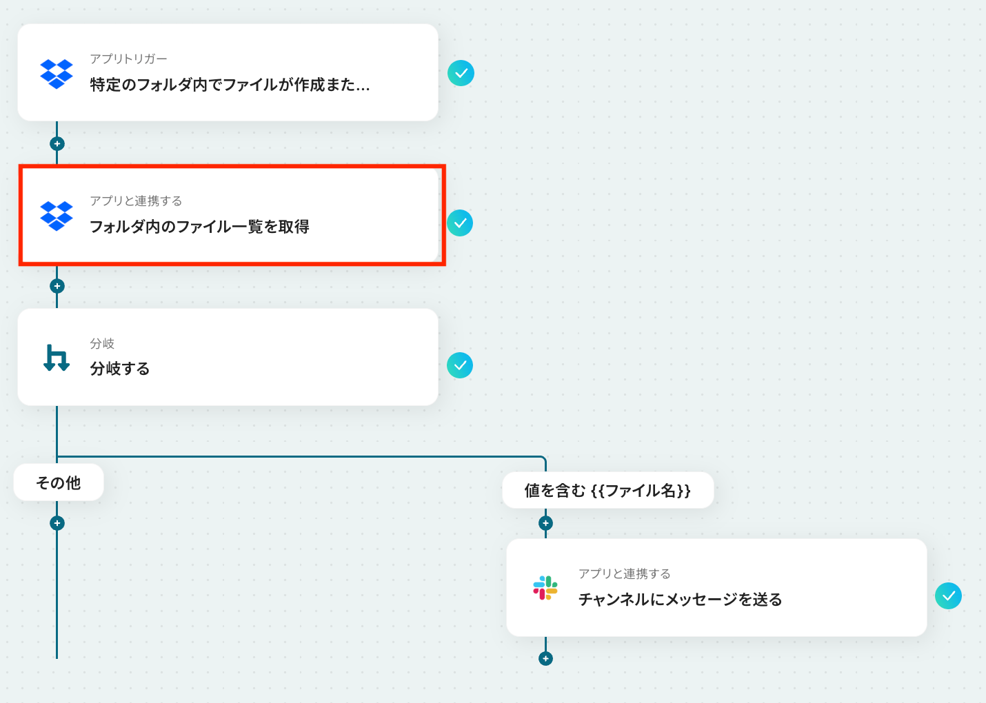 - 繰り返し処理では、Dropboxから取得したファイル一覧の中から、特定の条件に合致するファイルのみを処理の対象とすることもできます。
