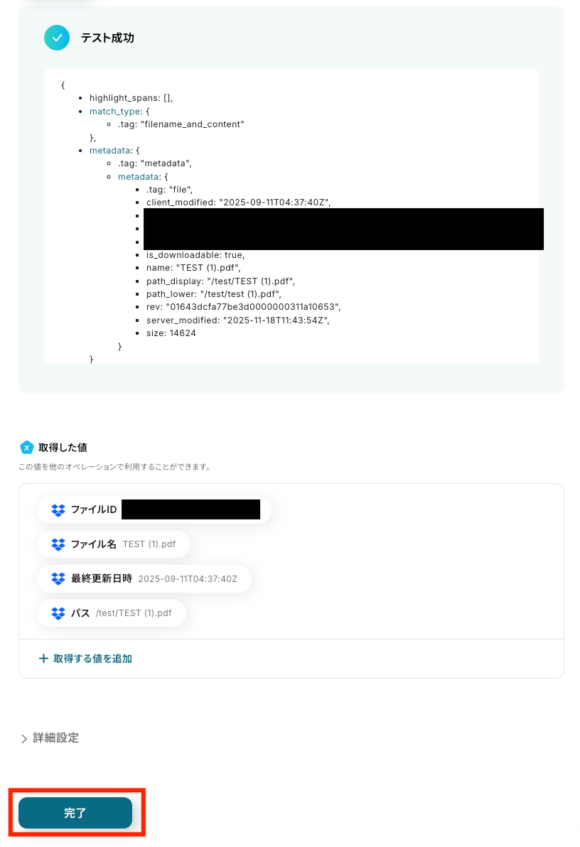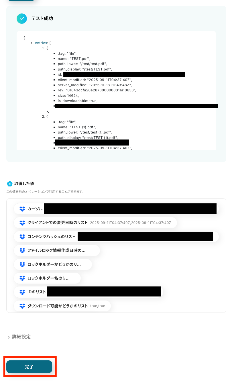 テストが成功すると、取得したファイル情報が表示されます。