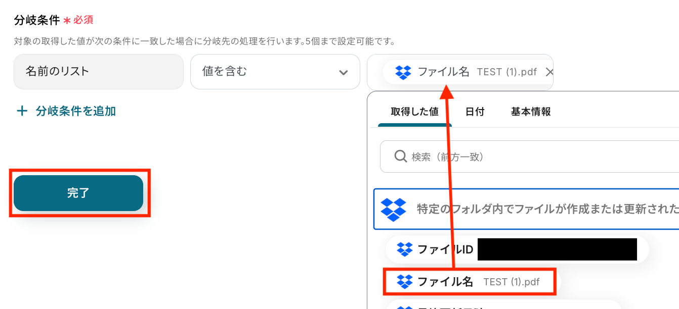 比較する値として、トリガーで検知したファイル名(TEST (1).pdf)を指定します。