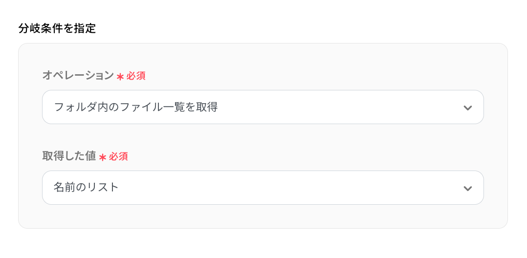 - 次に、オペレーションで「分岐機能」を設定し、アップロードされたファイル名が既存のファイル一覧に存在するかどうかで処理を分けます