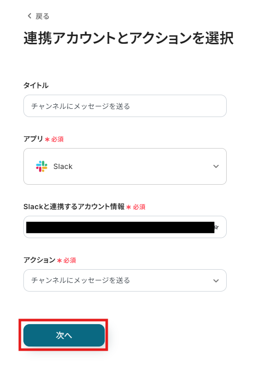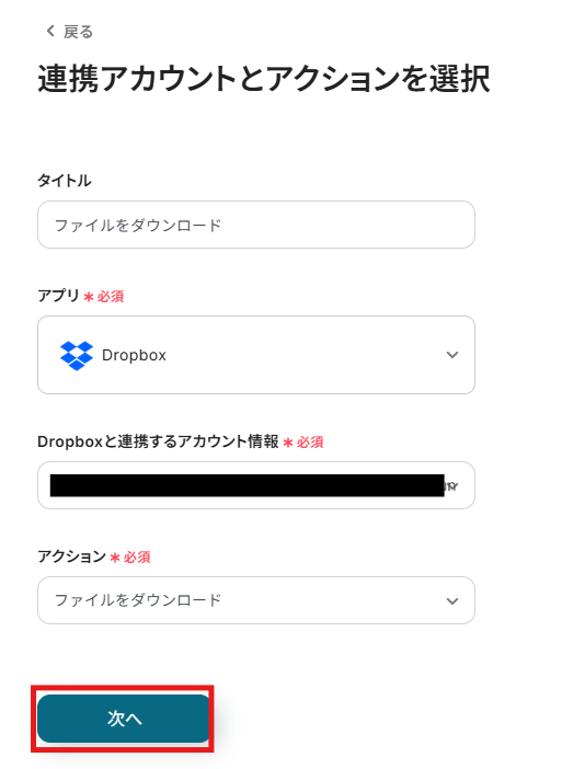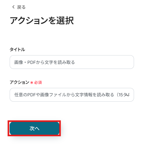 2.表示された画面で必須項目を入力し、アクションはそのままで「次へ」をクリックしてください。