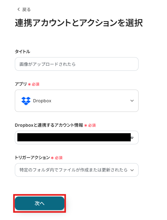 2.表示された画面で必須項目を入力し、トリガーアクションはそのままにして「次へ」をクリックします。