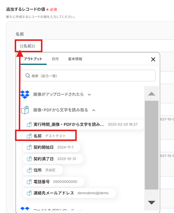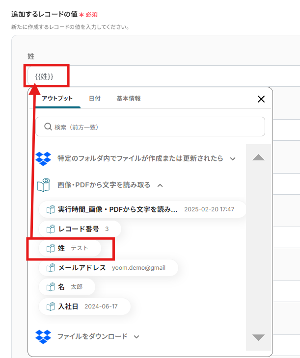 2.「追加するレコードの値」は、入力欄をクリックして表示されるアウトプットから選択してください。
